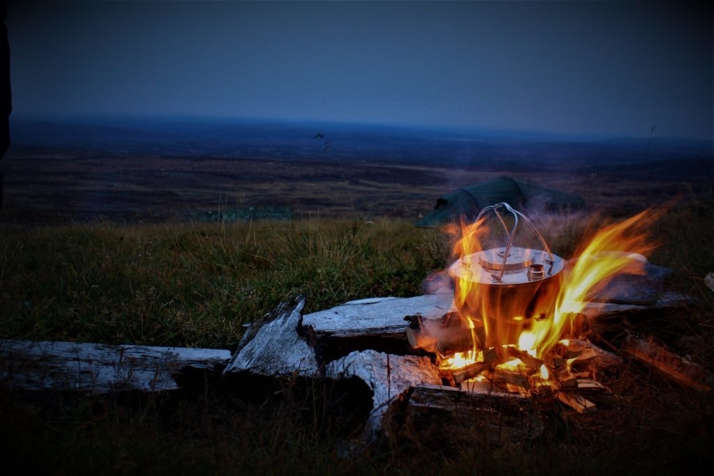 Etter litt frem og tilbake så forstod tsjekkerne etter hvert at det var ved jeg spurte om, ikke fyrstikker og tenneveske. Men de insisterte på å sage og kløve veden – skikkelige gentlemen. Bill fikk og noen nye kompiser. Jeg fikk fylt opp en pose og trasket fornøyd opp. Monika var ferdig med telte og vi la sakene inn, for nå begynte det å bli rått ute. Stillongser, luer, tykke ullgensere, tørre sokker, campsko og boblejakker kom på, før vi kunne sette oss ved bålet og spise. Bålet ble fyrt opp i en gammel bålplass. Tørrmat er godt etter en lang dag i fjellet. Vår ble bløtt opp med varmt vann, mens Bill tok sin mat knusktørr.