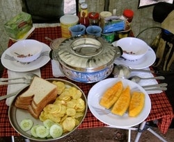 Klokka 07.00 stod vaskevannet klart utenfor teltet og det var på tide å stå opp. Vi hadde hatt en utmerket natts søvn i våre fantastiske soveposer og var klar for en ny dag. Kl. 07.30 ble frokosten servert i matteltet. 3-retters frokost, egg, bacon, frukt, brød... Ja, en skikkelig hotellfrokost var det vi fikk. Lite minnet om vår forrige frokost i fjellheimen som bestod av døll havregrøt. Allerede nå hadde turen overgått alle våre forventninger. Spise frokost med stoler, bord og duk er faktisk helt ålreit.