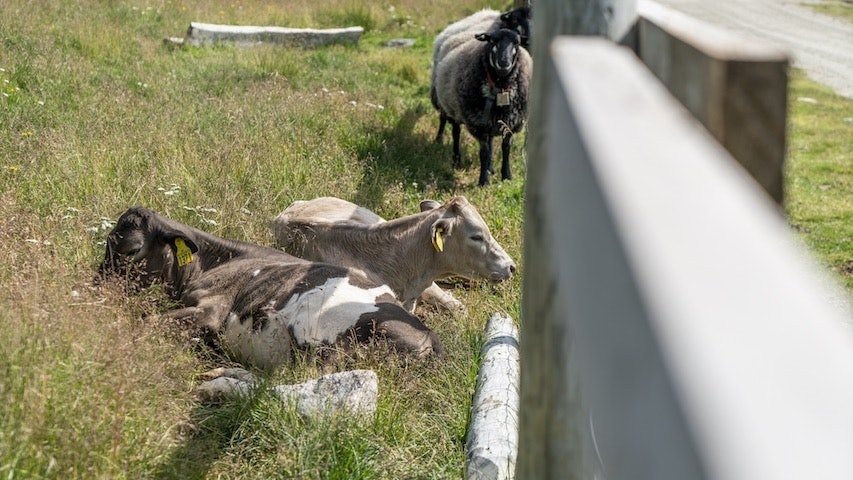 Bak eit gjerde har to kalvar og nokre sauer funne ro og næring på ei eng. Også dei tobeinte nyt stilla på setra, kastar skjorta og lener seg attover i solstolane sine. Utsikta strekker seg heilt til toppar i Skjåk, der snøfonnene ikkje vil rekke å smelte før ein ny vinter pustar rim på oss att. Denne dalen er mild og mjuk i kantane. Perfekt for husdyr som skal ete seg feite, og for ein liten kar på knapt eitt år, med nyutsprungen forskartrong.