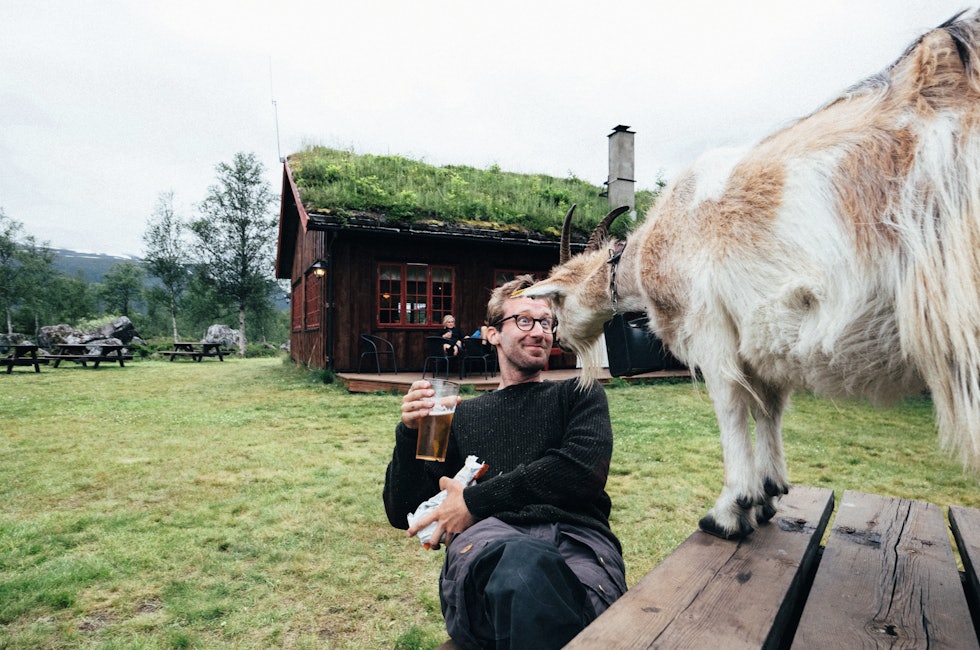 Noe sier meg at den geita hvertfall har fått smake potetgull tidligere, selv om den fremstår edru. Det er nå alle komfort-grammene som nesten sendte meg i rundkast ned fjellet mot Sunndalen skal komme til sin rett. Tortellini. Salsiccia-pølse. Cherrytomater. Nam.