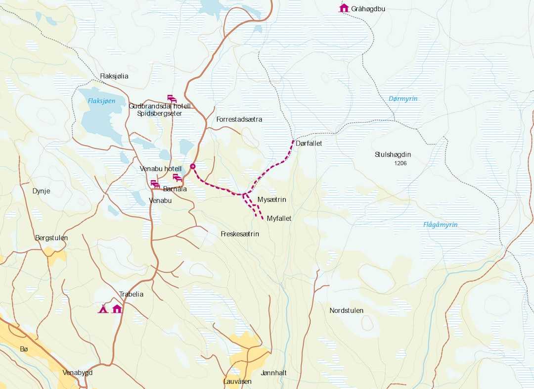 Parkeringsplassen ved Venabu fjellhotell er en naturlig start fortur til Dørfallet og Myfallet. Det er et tradisjonsrikt hotell som opprinnelig var en fjellstue.