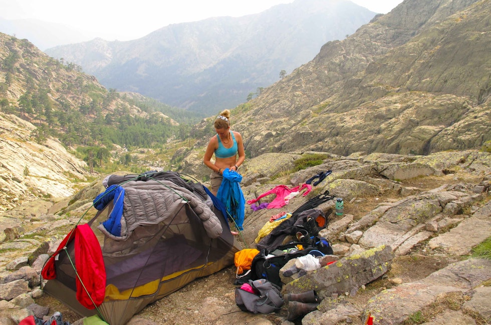 Med gårdagens do-køer og oppfylte teltcamper ferskt i minnet, velger vi å slå leir utenfor hytteområdet. På en liten oppdagelsesferd rundt plassen, lokaliserer vi til vår store forbauselse at bakgården vår skjuler en oase av rennende vann i en perfekt dusjformasjon. Vannet er så kaldt at hjernefrys og hyperventilering er uunngåelig. For å skåne hverandre fra vår egen kroppslukt og skitne tær, piner vi oss gjennom det. Sokker og trøyer får en vask på lik linje med oss selv, og henges opp i trærne så campen med ett forvandles til en tur-aktig taterleir. Slitne og tilsynelatende rene, legger vi oss i soveposen med en krystallklar stjernehimmel over hodet. Før jeg rekker å oppnå hvilepuls, gleder jeg meg allerede til neste dag på GR20. Vi sovner til lyden av lett bris i tretoppene og ett og annet fuglekvitter i det fjerne. Selv om lår, knær og legger er uenige, så elsker vi Korsika allerede etter dag to. Elsker det. Virkelig.