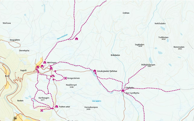TID: Høvringen–Grimsdalshytta: Ca. 8 timer, Høvringen–Dørålseter: Ca. 7 timer, Høvringen–Rondvassbu: Ca. 6 timer, Høvringen–Mysuseter: Ca. 5 timer, Høvringen–Putten Seter over Karihaugen: 2–3 timer, Putten Seter–Høvringen over Heimfjellet: 2–3 timer, Haukberget: Ca. 1,5 time