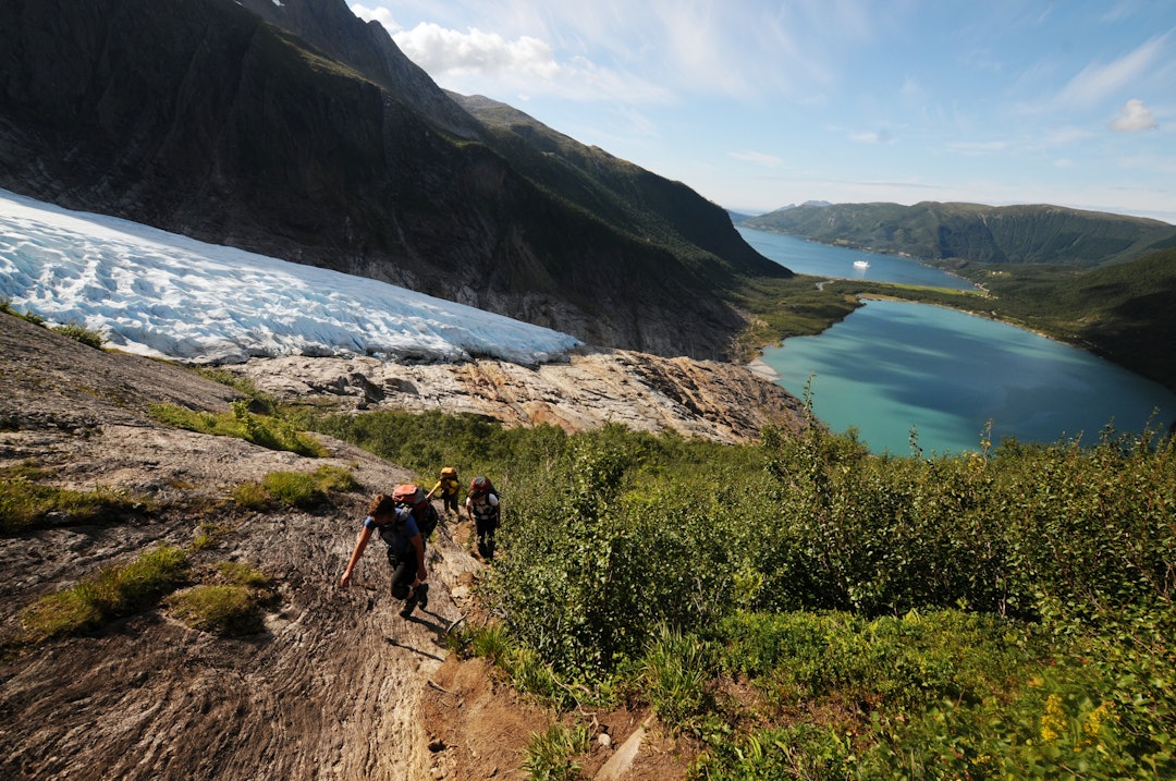 Himmelen har tiltatt i sitt rødskjær. Stemningen over landskapet er nærmest å beskrive som ubeskrivelig. Fra den luftig beliggende Tåkeheimen stirrer vi ned på fjelltoppene som stiger spisse opp av kysten. Vi ivrer etter å gå løs på toppturen. Komme oss enda høyere opp. Se utover hele Svartisen. Se helt til Lofoten og Træna. Skue utover landet. Det begynner med bratt steinur. Anne Maria som stifinner, vi andre klyvende etter. På vei opp mister vi Tåkeheimen av syne for en stund. Omtrent halvveis dukker hytta opp igjen. Sett ovenfra er hytta enda mer fascinerende der den ligger tett inntil den gedigne brekanten som strekker seg innover i fjellplatået under oss.