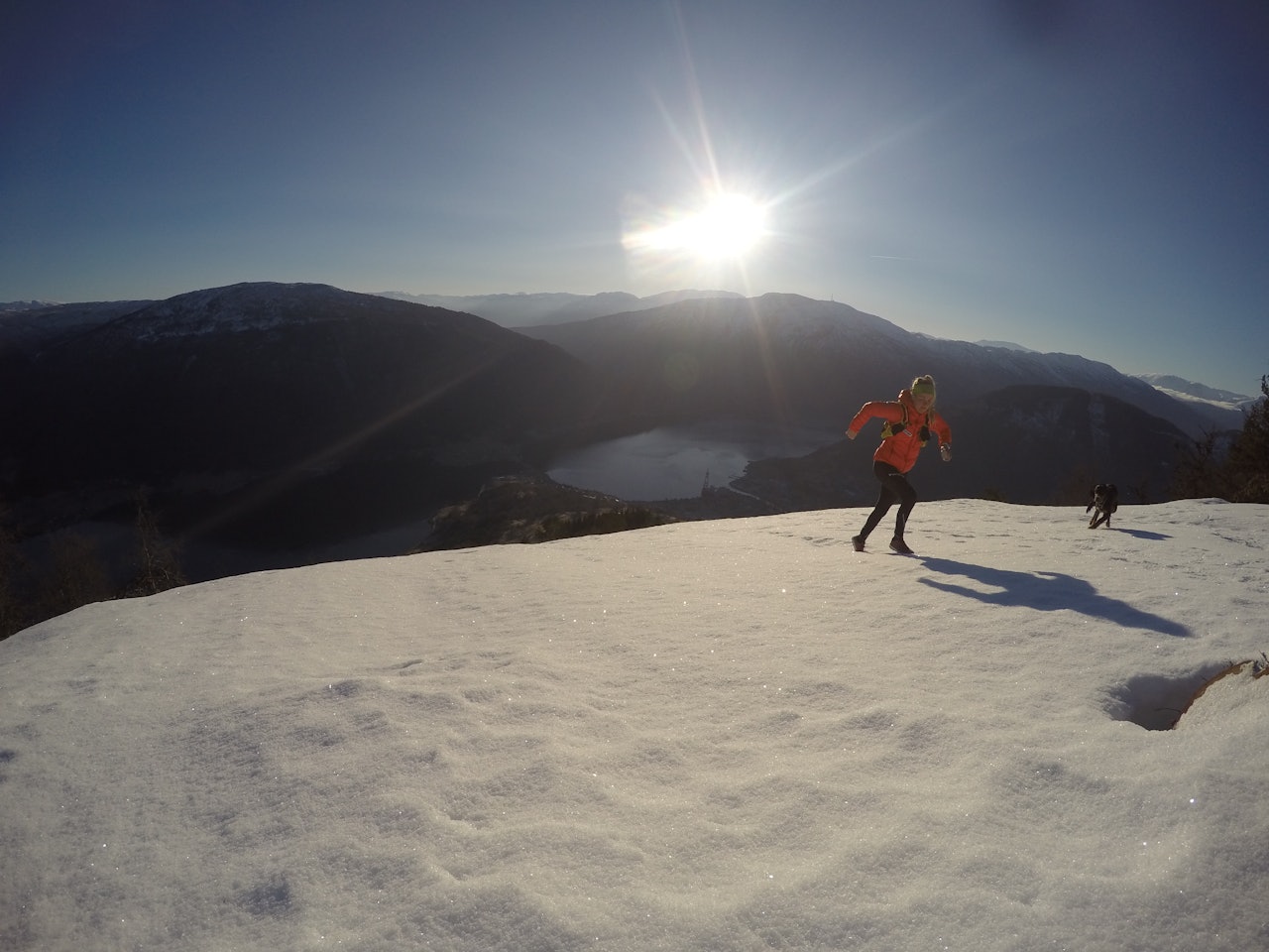 Det er heilt sikkert nokre som ikkje meiner det å springe rundt i skogen kan kategoriserast som friluftsliv, eller som ikkje ser poenget med dette kavet. Sjølv synes eg det er som å få både i pose og sekk. For ved sidan av gleda ved å vere ute, utsynet, fargekombinasjonane i skogen og dyrespor i snøen, får eg pressa kroppen til det yttste under hardøktene, og jobba med arbeidsøkonomien på langturane. Eg må vere så ærleg å legge til at eg ikkje alltid får med meg fuglekvitter og bekkesus når eg spring intervallar, men den følelsen eg sit igjen med etter slitet er ubeskriveleg.