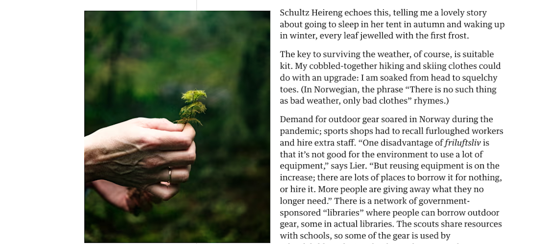 I Guardian-artikkelen påpekes det at friluftsliv ikke er en egen aktivitet, men at en tur i skogen, padling på fjorden og skikjøring i fjellet kan være en del av det, like mye som å plukke bær eller å sette seg ned et sted i naturen.