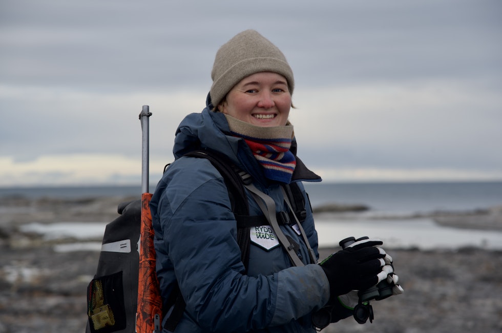 Isbjørnvakta skuer ut over det karrige landskapet av stein, grus og drivtømmer. Hun holder utkikk etter noe gul-hvitt som kan bevege seg over lange strekninger på den arktiske tundraen.