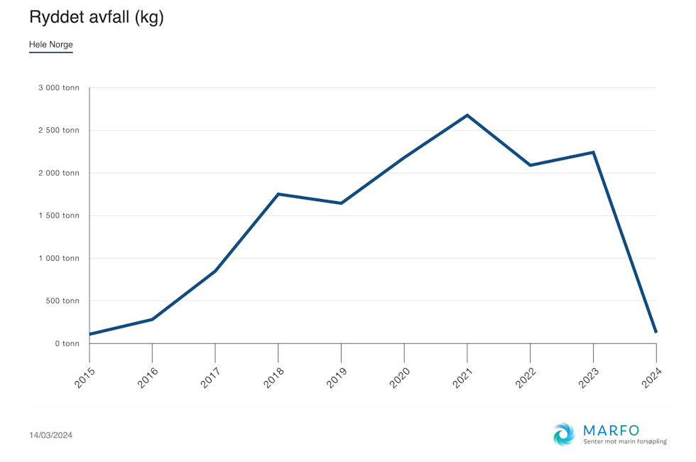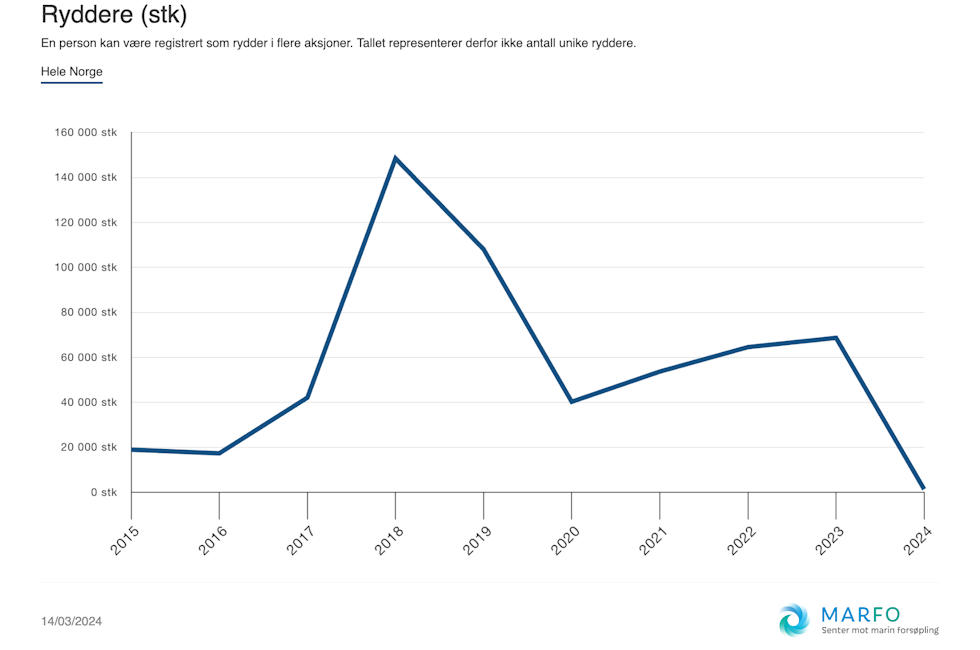 I 2023 ble det registrert over 6 000 ryddeaksjoner og over 2 000 tonn innsamlet marin forsøpling. Alle som får støtte må registrere sine ryddeaksjoner.