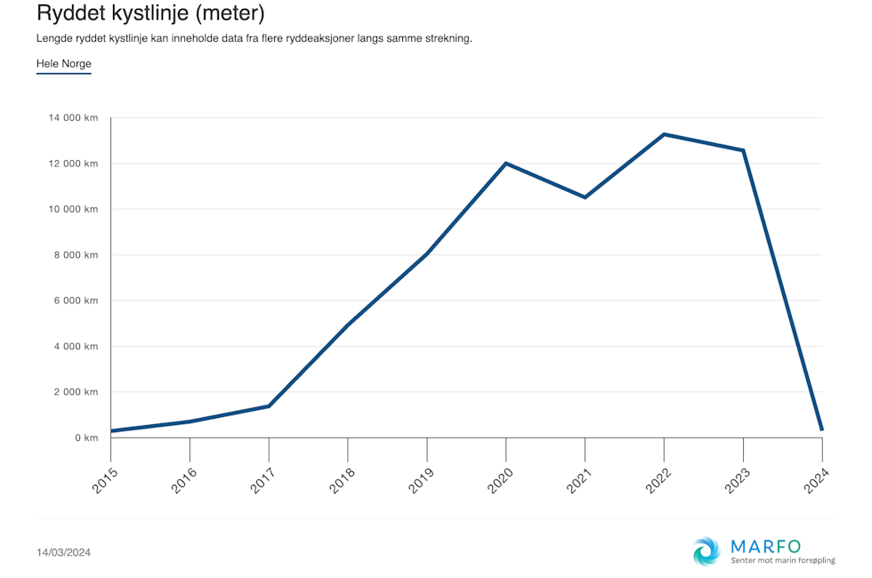 Siden registreringene begynte har det blitt ryddet 50 900 km med strandlinje i Norge. Det tilsvarer mer enn distansen rundt jorda ved ekvator.