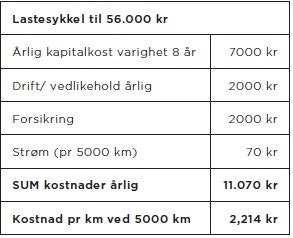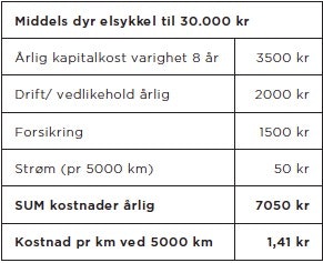 Med antagelse om nypris på 15.000 kroner, fem års avskrivning og 50 kroner i strøm i året, vil en rimelig elsykkel koste deg litt over 6000 kroner i året. For en som reiser med bil til jobben, og som har 10 kilometer reisevei, vil det å erstatte tre bildager i uka med elsykkel innebære en sparing på over 300 kroner i uka.