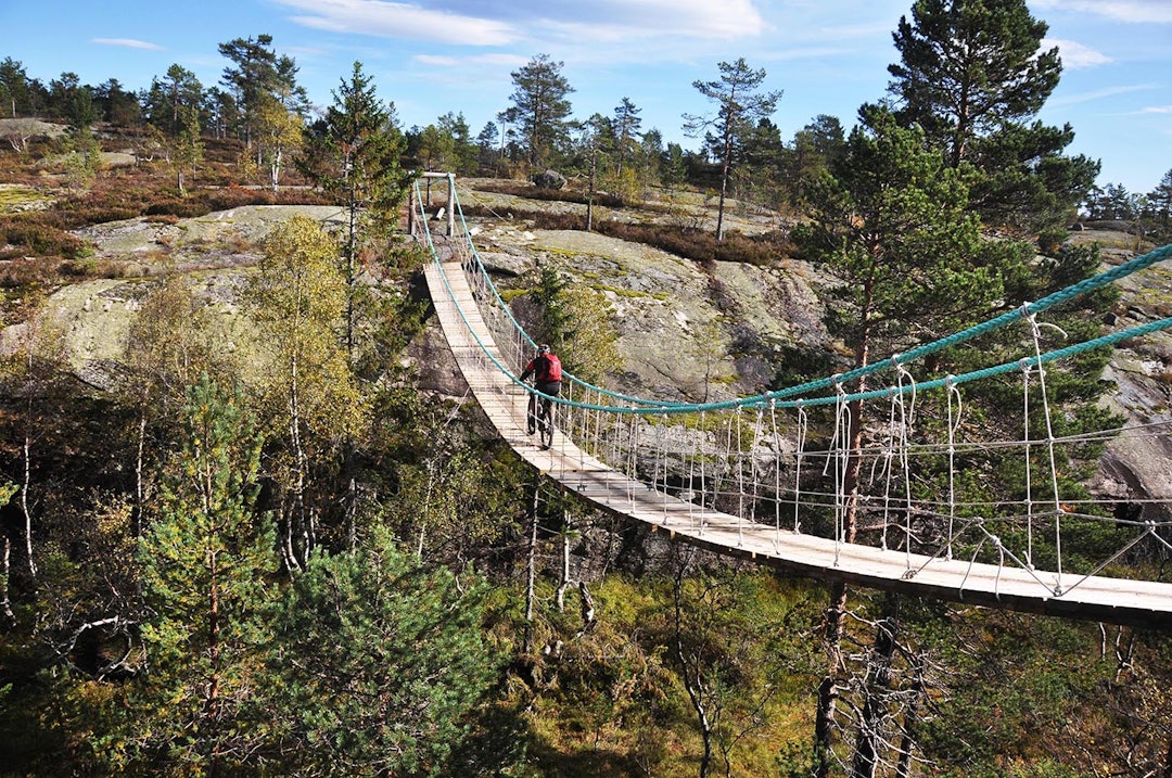 Over blanke granittsva, tørre stier, myrer og hengebroer. Til og med oppover en elv er det mulig å sykle, får vi erfare. Her er det nok stier til flere timers turer på sykkelsetet.