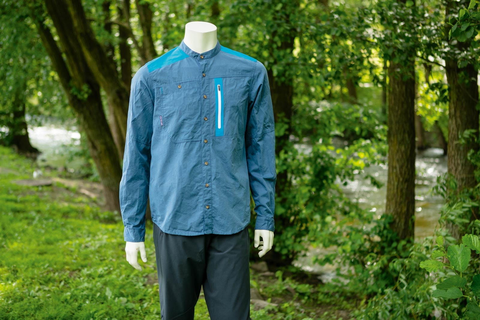 Skjorta er forsterket med polyamid og elastan på skuldrene og albuene og tåler derfor langvarig sekkebæring og at du gnir sekken mot albuen når du tar den av og på.