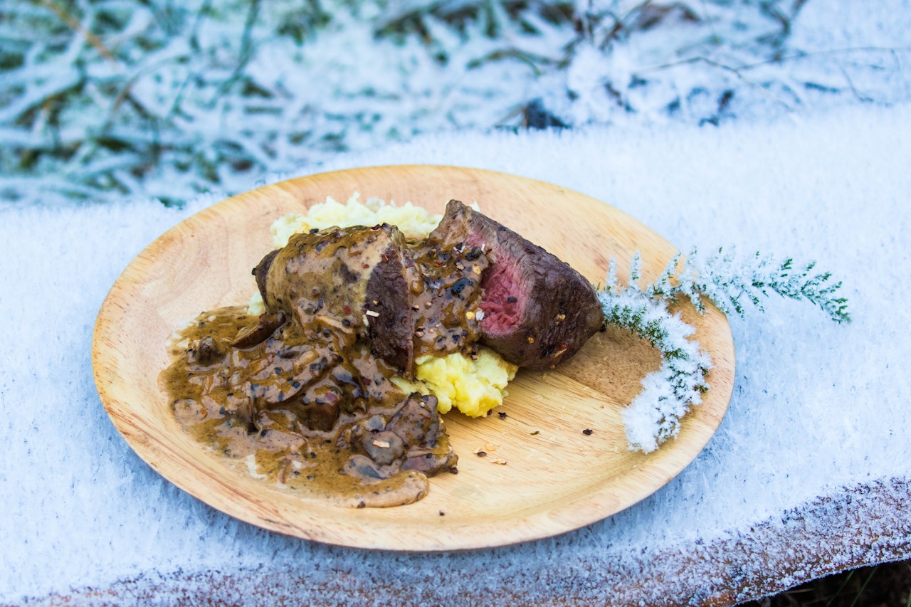 Når det er gjort, løftar du biffane over på eit fat slik at dei får kvila seg. Ha no i sopp og løk i små bitar, i panna som framleis har godt med smør og krydder.